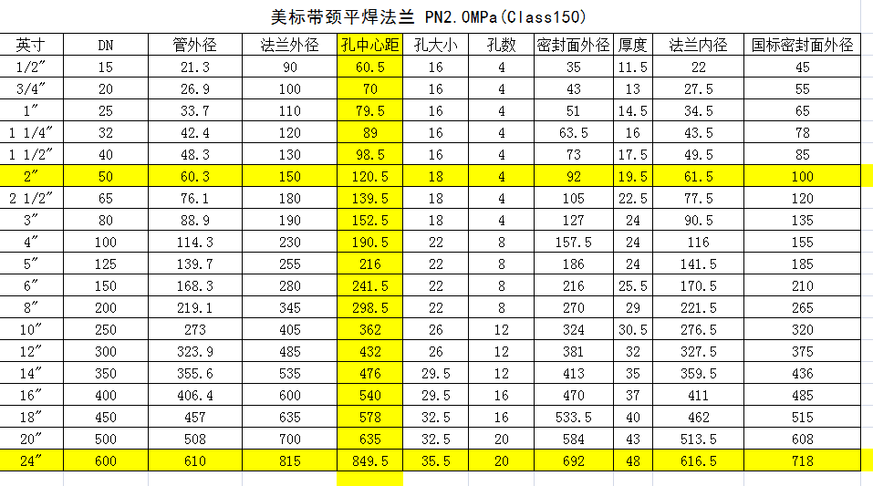 美標法蘭通常是指作為美國 國 家標準的ASME B16.5、B16.36、b16.47、B16.48所描(miáo)述的法蘭(lán)標準。美標(biāo)法蘭(lán)的壓力等(děng)級適用再PN2.5~PN4.0。材質可(kě)為碳鋼、304、316、316L等。美標法(fǎ)蘭尺寸標準和我們國標或者行標法蘭不同(tóng)。那(nà)麽,美(měi)標帶頸平焊法蘭的尺(chǐ)寸是怎樣的呢?下麵我們來了解一下: